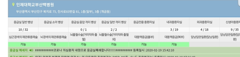 부산 개금에 있는 인제대 백병원 본원 응급실도 코로나 의심환자 내원으로 15시 이후에 폐쇄되었다고 합니다.