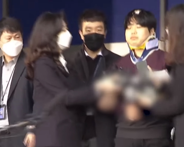 25일 종로경찰서에서 언론 앞에 모습을 드러낸 조주빈은 목에 깁스를 하고 반창고를 붙인 모습이었다.