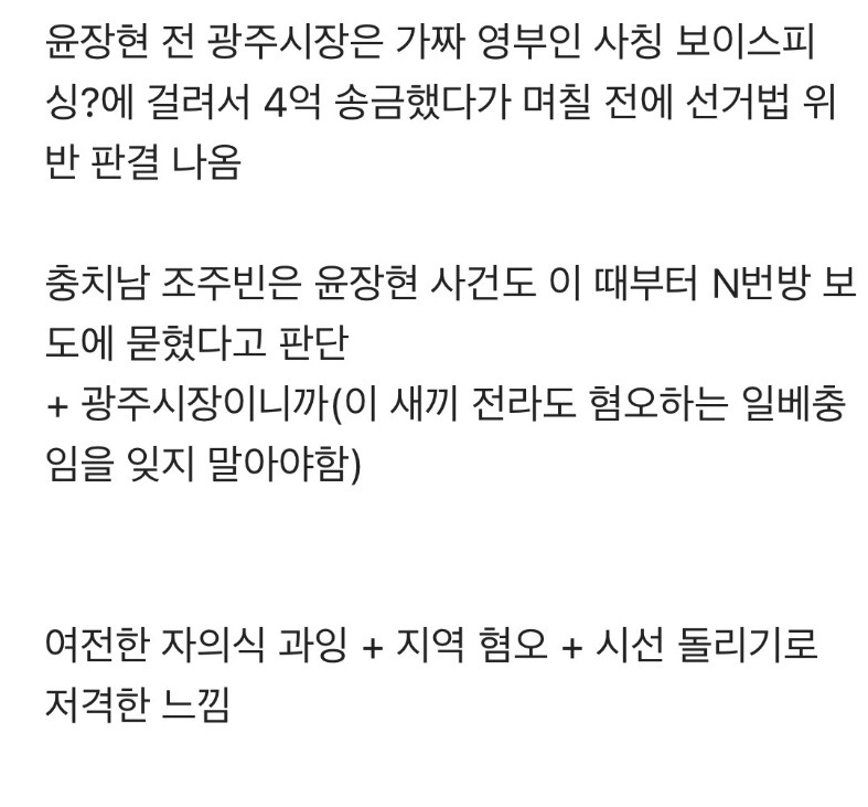 아울러 윤장현 전 광주시장의 경우 가짜 영부인 사칭 보이스피싱에 걸려 4억을 송금해 선거법 위반 판결을 받았다.