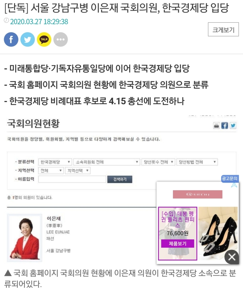 기독자유통일당에서 퇴출된 강남병 이은재, 한국경제당 입당 본문