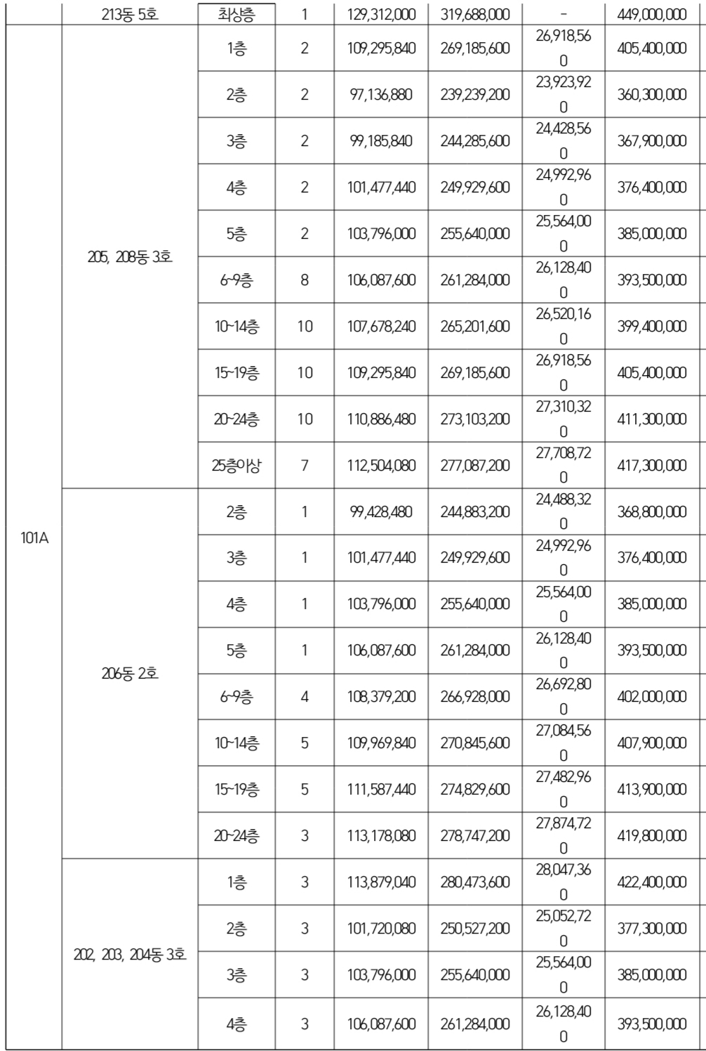 101A최상층 : 5.28억 ~ 5.45억 [606만원]