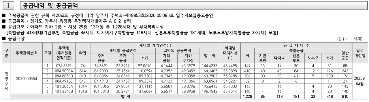 - 양주옥정신도시 제일풍경채 Lake City (A10-2BL) 분양 내역