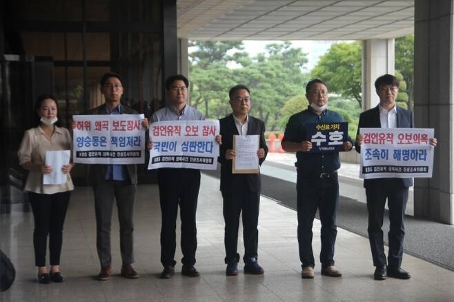 그러나 8월 5일, (위 사진에서 보이는) 소수노조 KBS노동조합, KBS공영노동조합, 미디어연대는 서울중앙지검에 양승동 KBS 사장, 김상근KBS 이사장, 김종명 보도본부장, 엄경철 통합뉴스룸 국장 등 9명을 위계에 의한 업무방해죄, 허위사실적시에 의한명예훼손 등의 혐의로 고발.