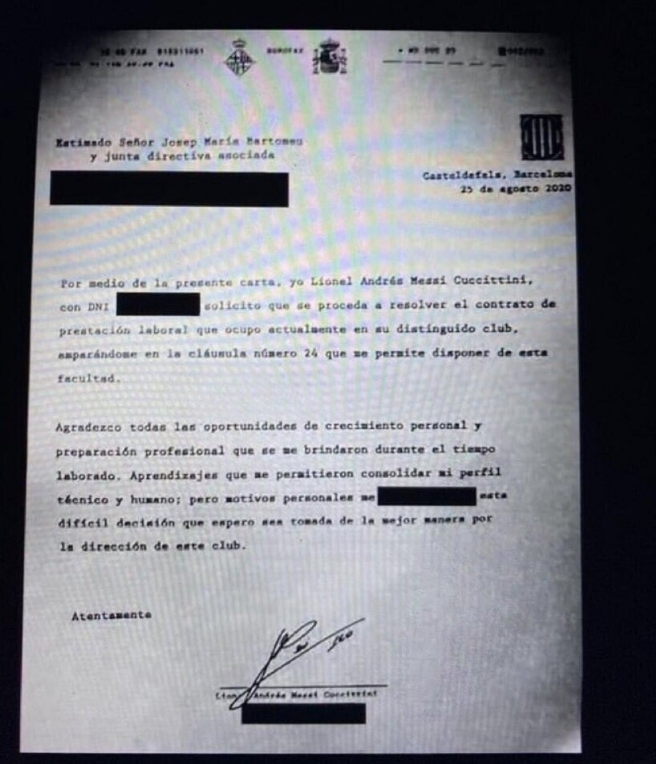 팩스에는 “나 리오넬 메시는 계약 조항에 의거해 클럽과의 계약 해지를 요구한다”고 말하며 “이곳에서 많은 것을 배웠으나 개인적인 이유로 어려운 결정을 내렸다”고 답했다.