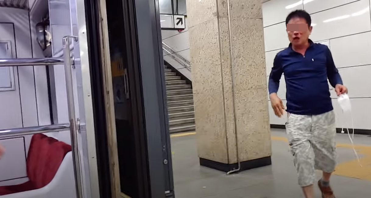 남색 셔츠를 입은 남성은 지하철에 들어온 후 승객들이 마스크를 쓴 것을 가지고 욕설을 퍼부었다.