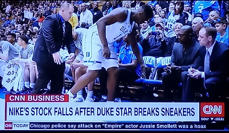 엄청난 유망주 자이온 윌리엄스의 신발 밑창이 터져 무릎부상당하며 교체당하는 사건이 발생