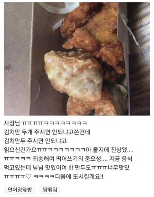 이에 A씨는 리뷰를 통해 “닭튀김을 주문하면서 ‘김치만 두 개 주시면 안 되냐’고 쓴 건데 ‘김치만두 주시면 안 되냐’고 읽으셨냐?”며 “졸지에 진상됐다”라고 민망함을 드러냈다.