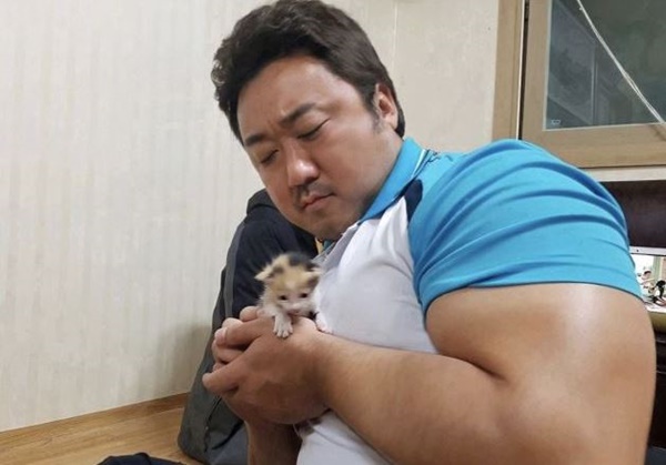 공개된 사진 속 마동석은 특유의 우람한 팔뚝으로 새끼 고양이를 안으며 안절부절하는 모습이다.