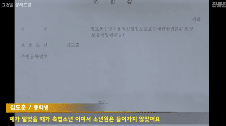 김도훈 군은 “제가 털었을 때가 촉법소년이어서 소년원은 안 들어갔다”라며 “보호처분을 받았다. 보호자하고 서류 같은 것을 작성해서 1개월마다 한 번씩 6개월을 법원에 제출해야 한다. 2호는 수강명령이라고, 학교 수업을 안 듣고 어디가서 21시간 동안 수업을 들어야 한다고 하더라”라고 했다.