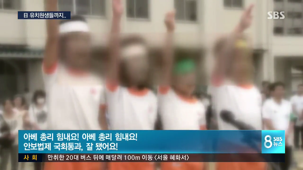 일본의 우경화가 심한 가운데 아베 정부가 지원하고 있는 것으로 알려진 일본의 한 유치원에서 어린이들이 받는 교육이 얼마나 심각한 지를 보여주고 있다.