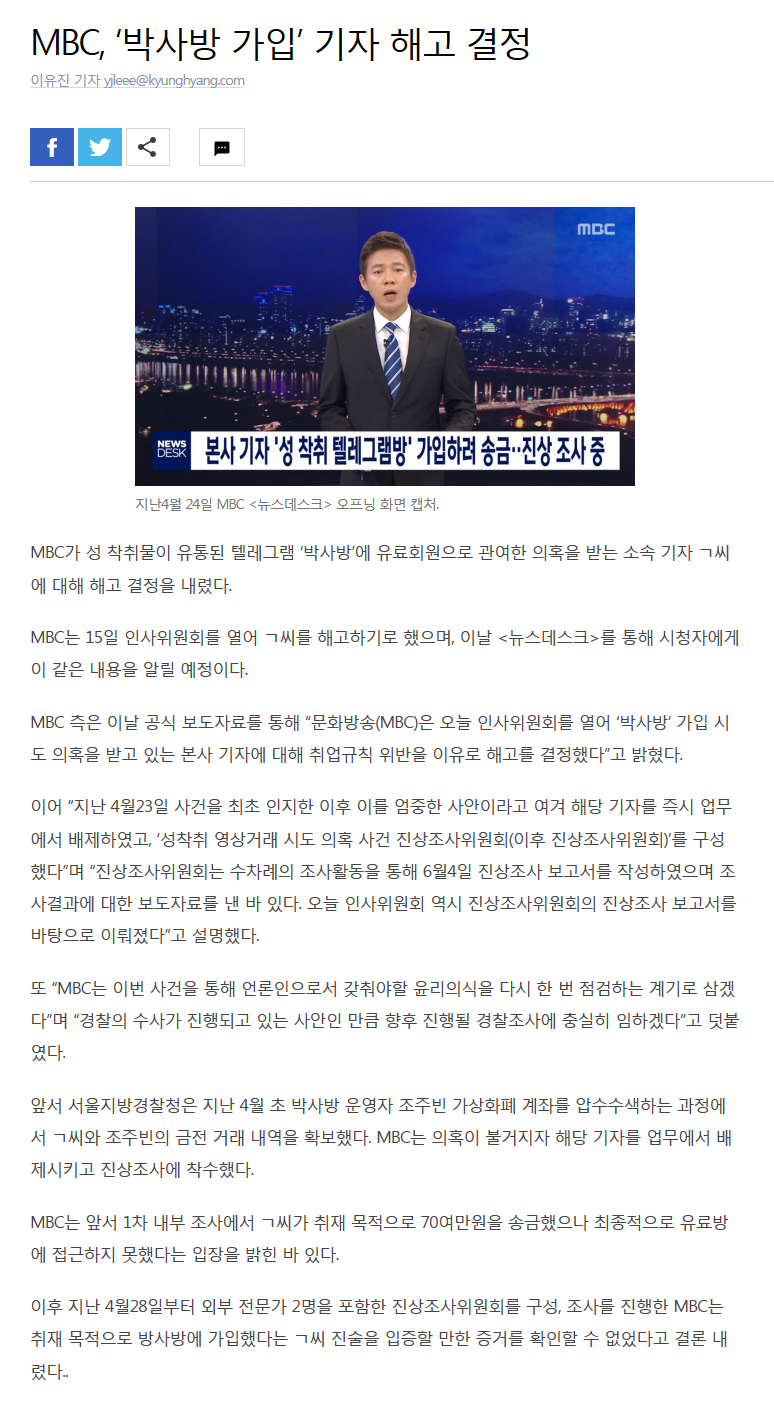 MBC, ‘박사방 가입’ 기자 해고 결정