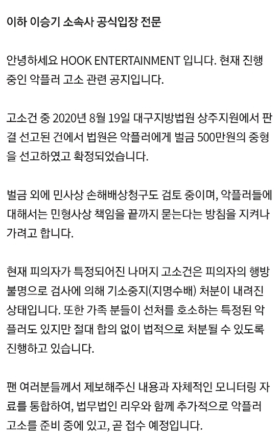 - 팬들이 제공한 자료와 자체 모니터링 자료로 악플러 더 고소할 예정